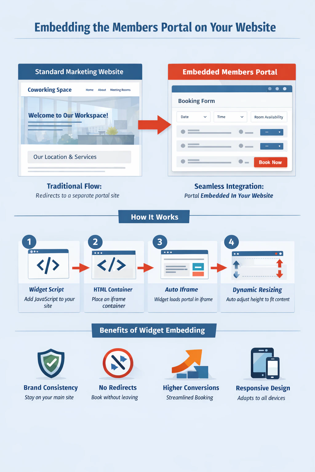 Widget embedding allows you to integrate specific sections of your members portal directly into your coworking space’s marketing website. Instead of redirecting customers to a separate portal domain, they can access booking forms, member directories, or other portal features while staying on your main website. This creates a seamless experience where customers never leave your brand environment, improving conversion rates and maintaining consistent visual identity throughout their journey.